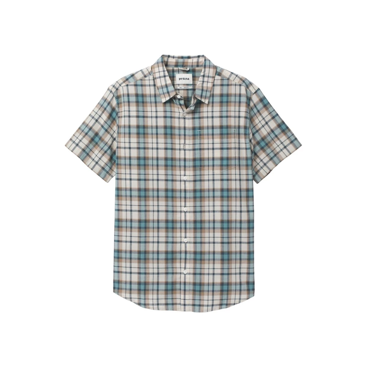Organic cotton/ recycled polyester blend plain weave • Gravel/ Birch yarn dye stripe • Shoreline/ Sweet Grass/ Manzanita yarn dye plaid • Front left chest pocket • prAna woven label at left side seam • Faux corozo buttons