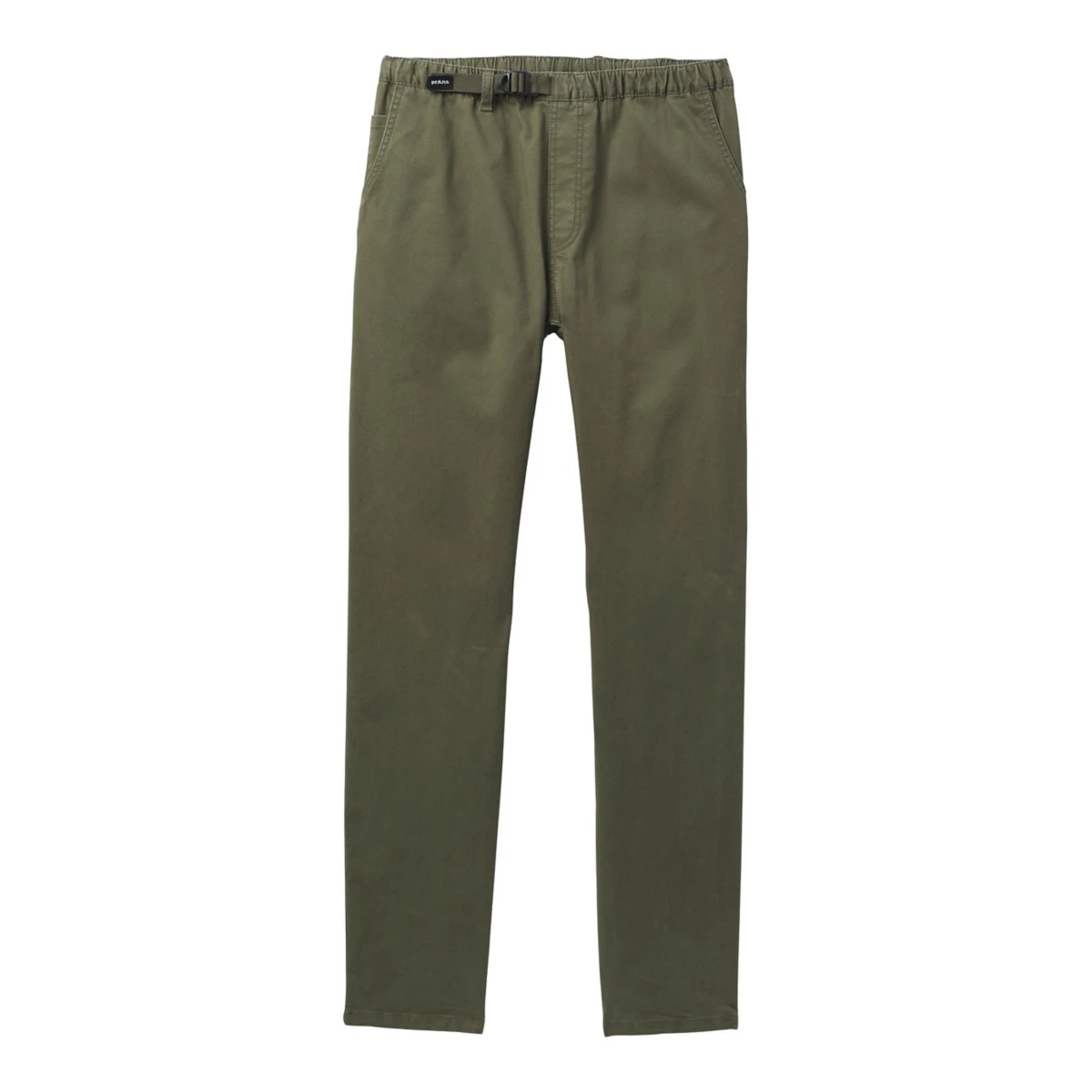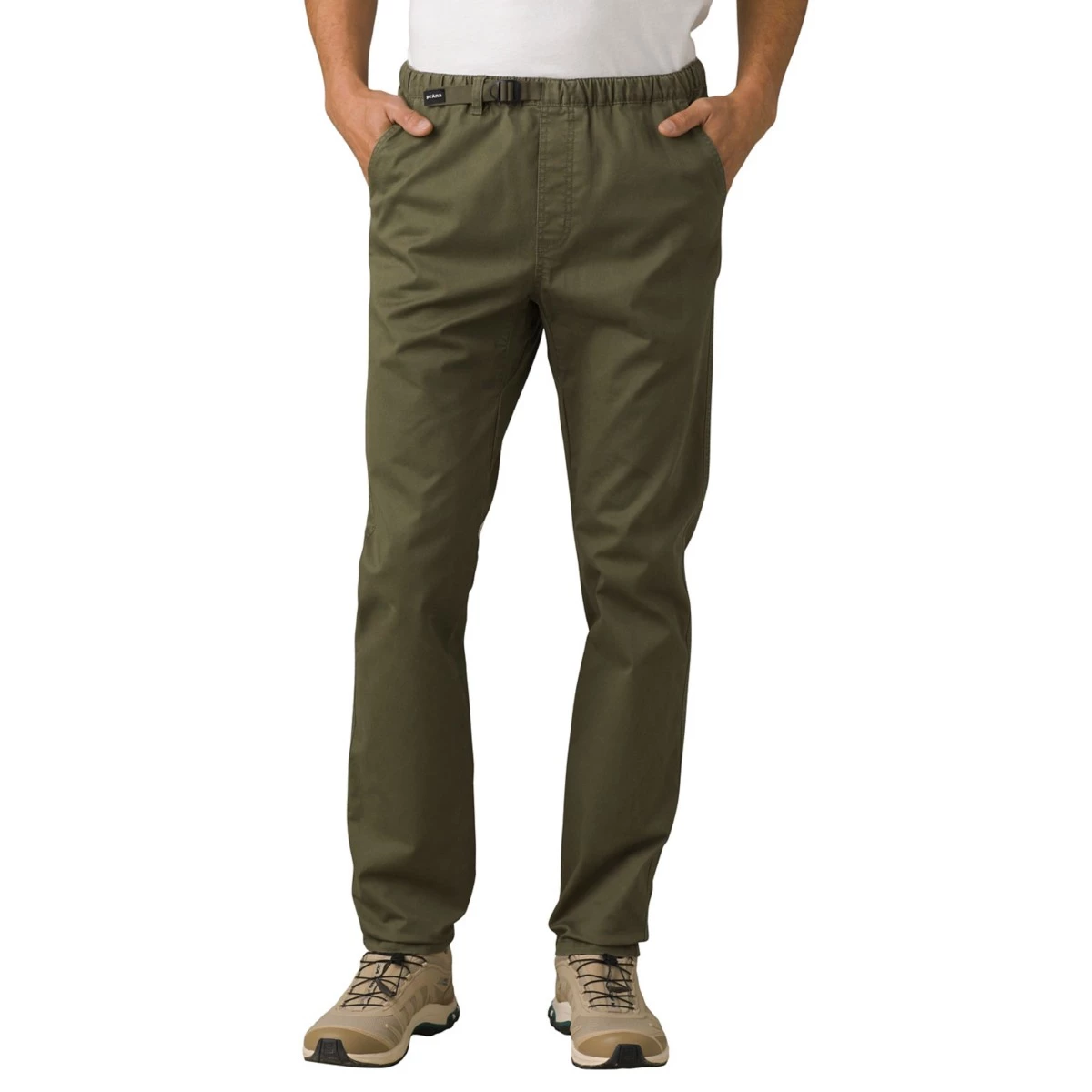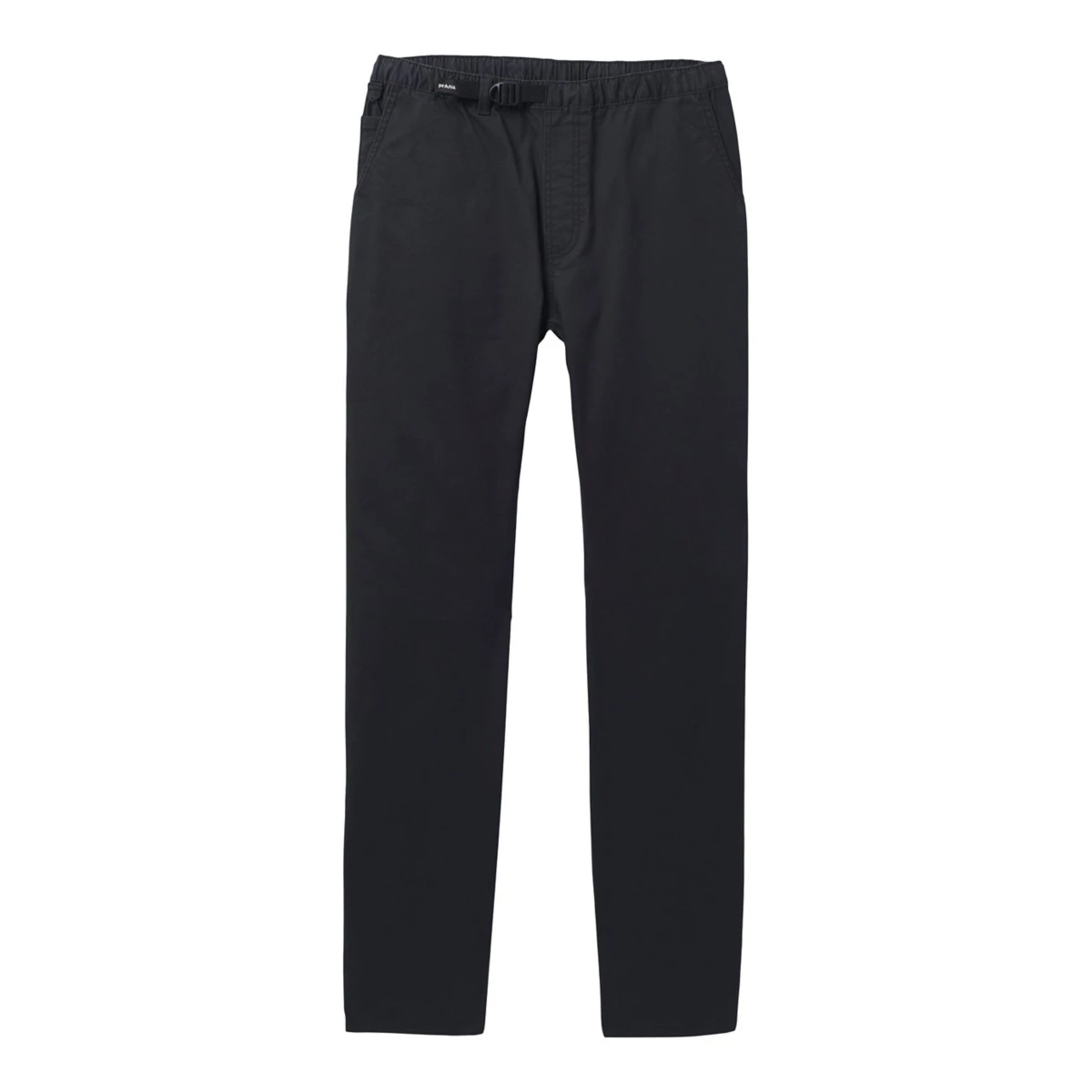 Organic cotton stretch fine twill fabric • Elastic waistband and leg cuffs • Webbing with tension lock cinch at front waist • Hidden elastic key loop at front coin pocket • Elastic loop at center back waist for chalk bag • Back patch pockets with flaps • Inseam gusset • prAna woven label at back right pocket • Standard – Tapered Fit