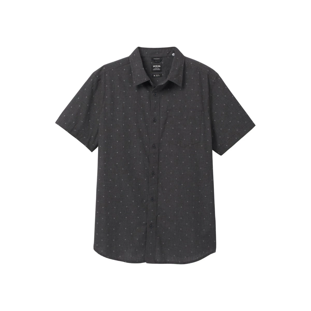 Organic cotton blend plain weave • Printed woven • Front left chest pocket • prAna woven label at left side seam • Faux horn buttons