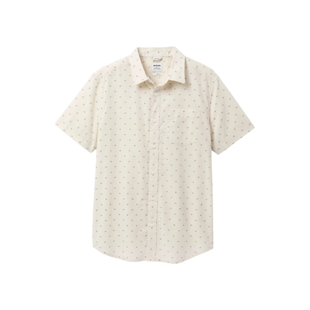 Organic cotton blend plain weave • Printed woven • Front left chest pocket • prAna woven label at left side seam • Faux horn buttons