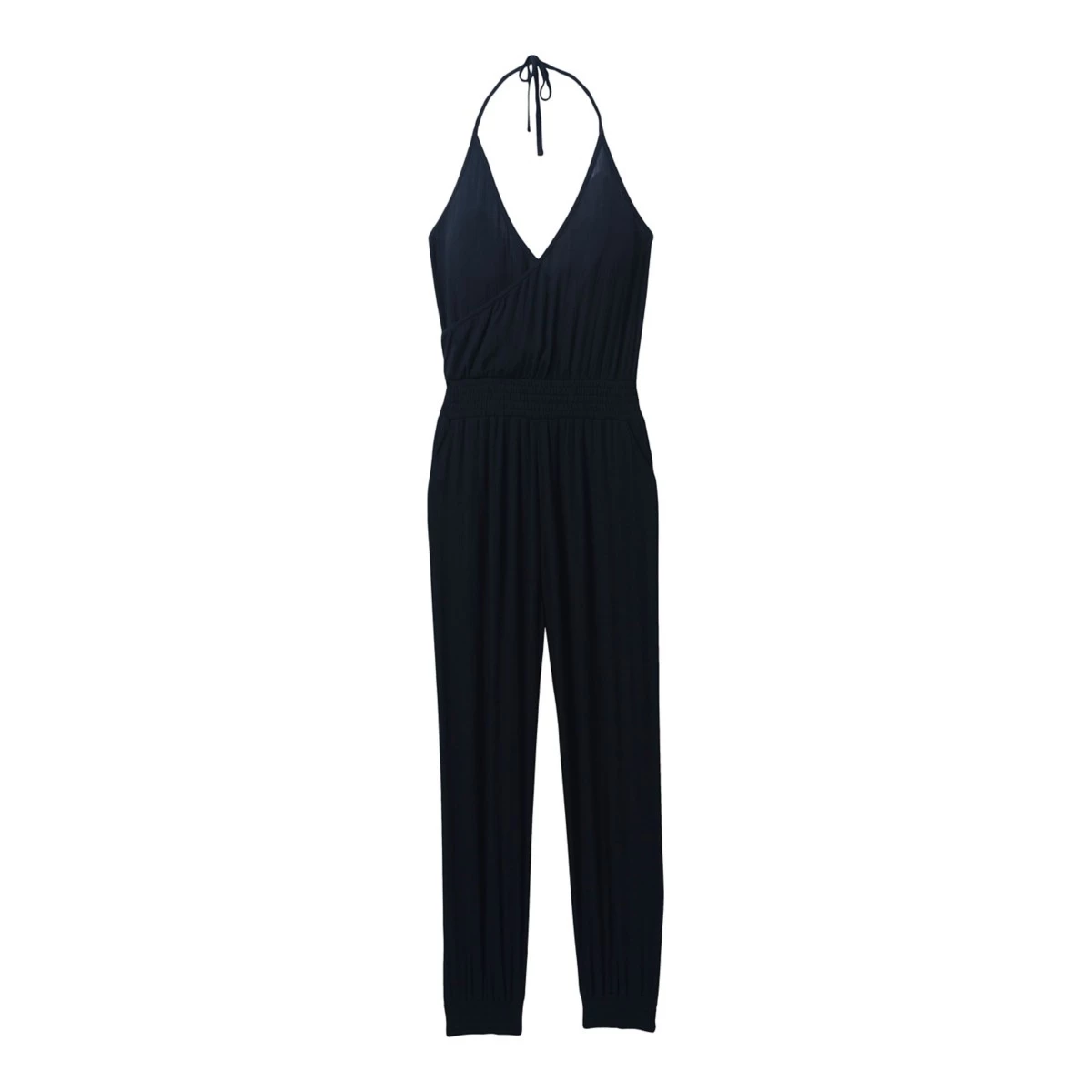 TENCEL™ Modal lightweight crinkle woven • Halter jumpsuit • Wrap halter neckline with spaghetti neck tie closure, • Wide elastic smocked waistband • Hand pockets • Tapered leg with elastic smocked cuff bands • Size: Small / Inseam: 28 1/2″ (72.39cm) • Relaxed Fit