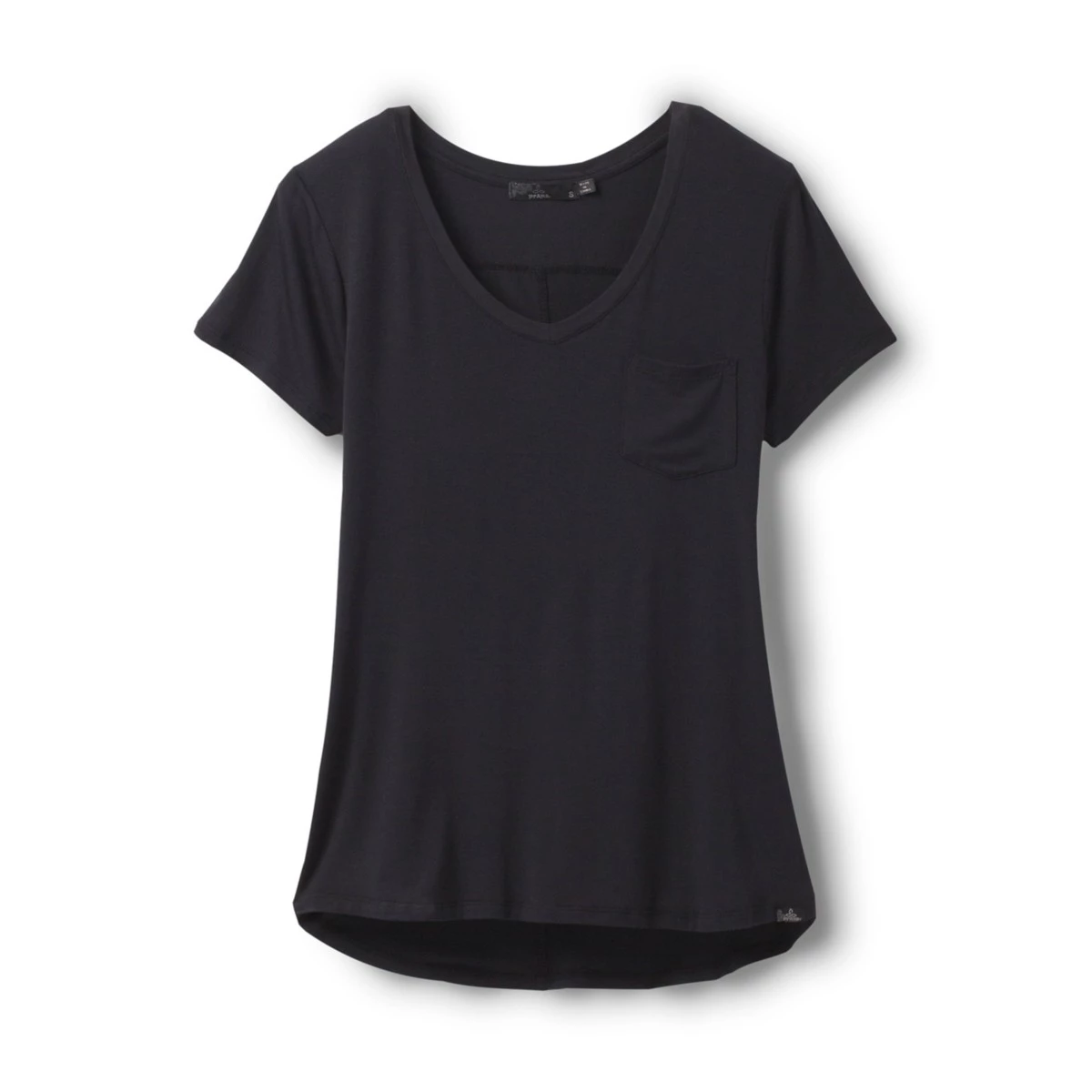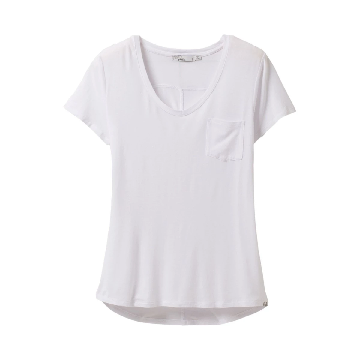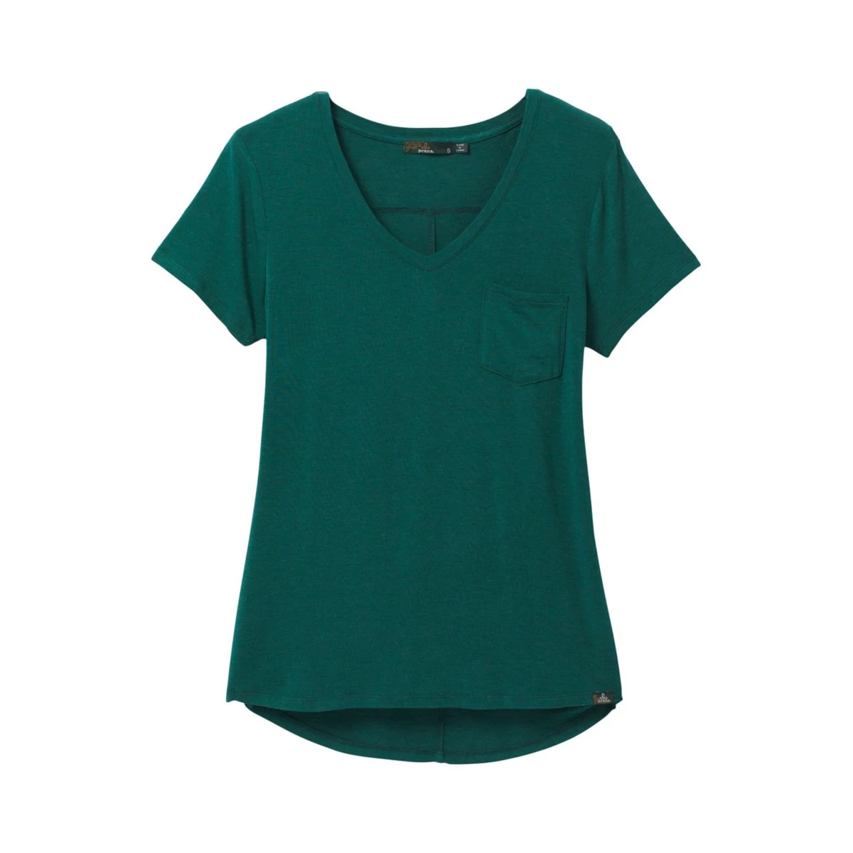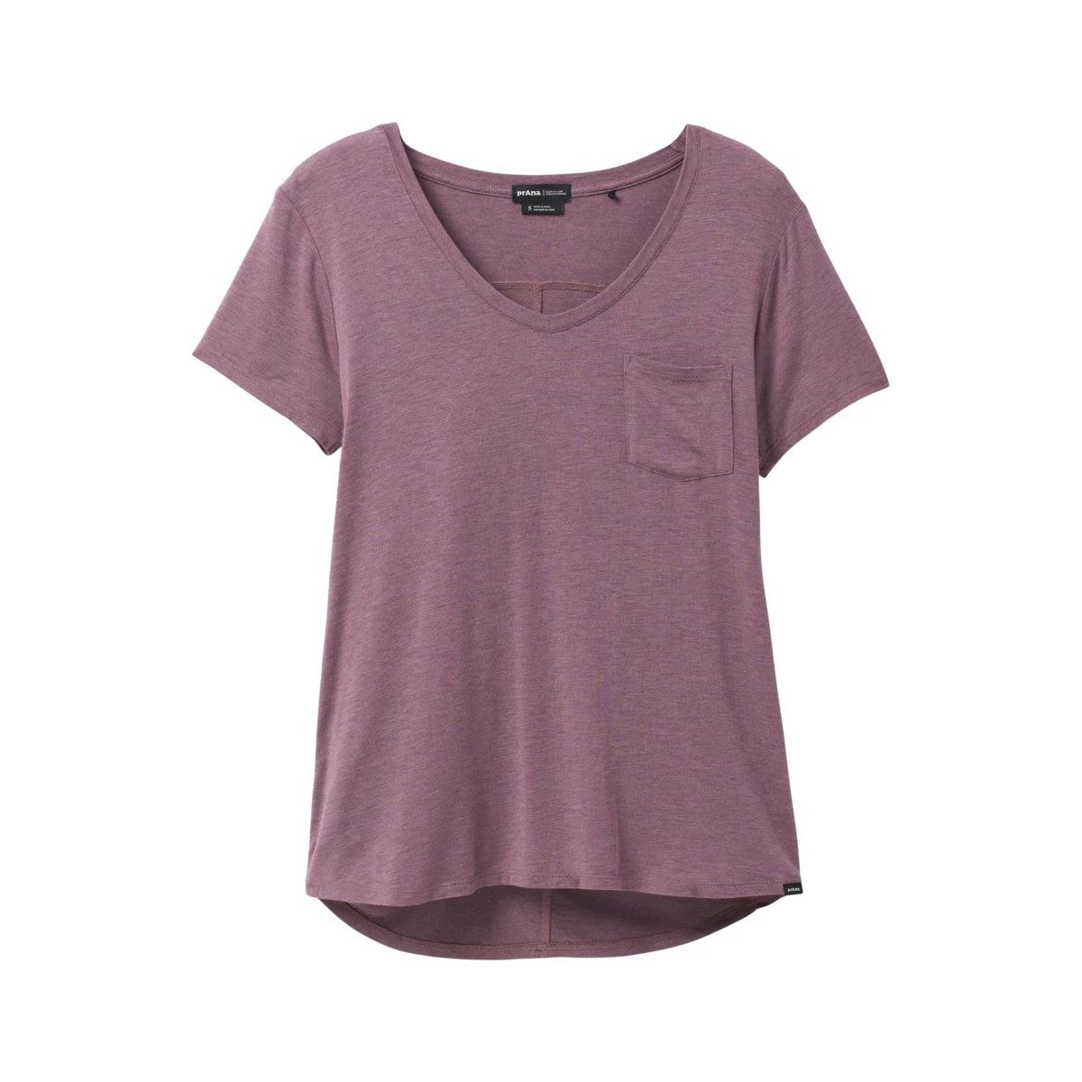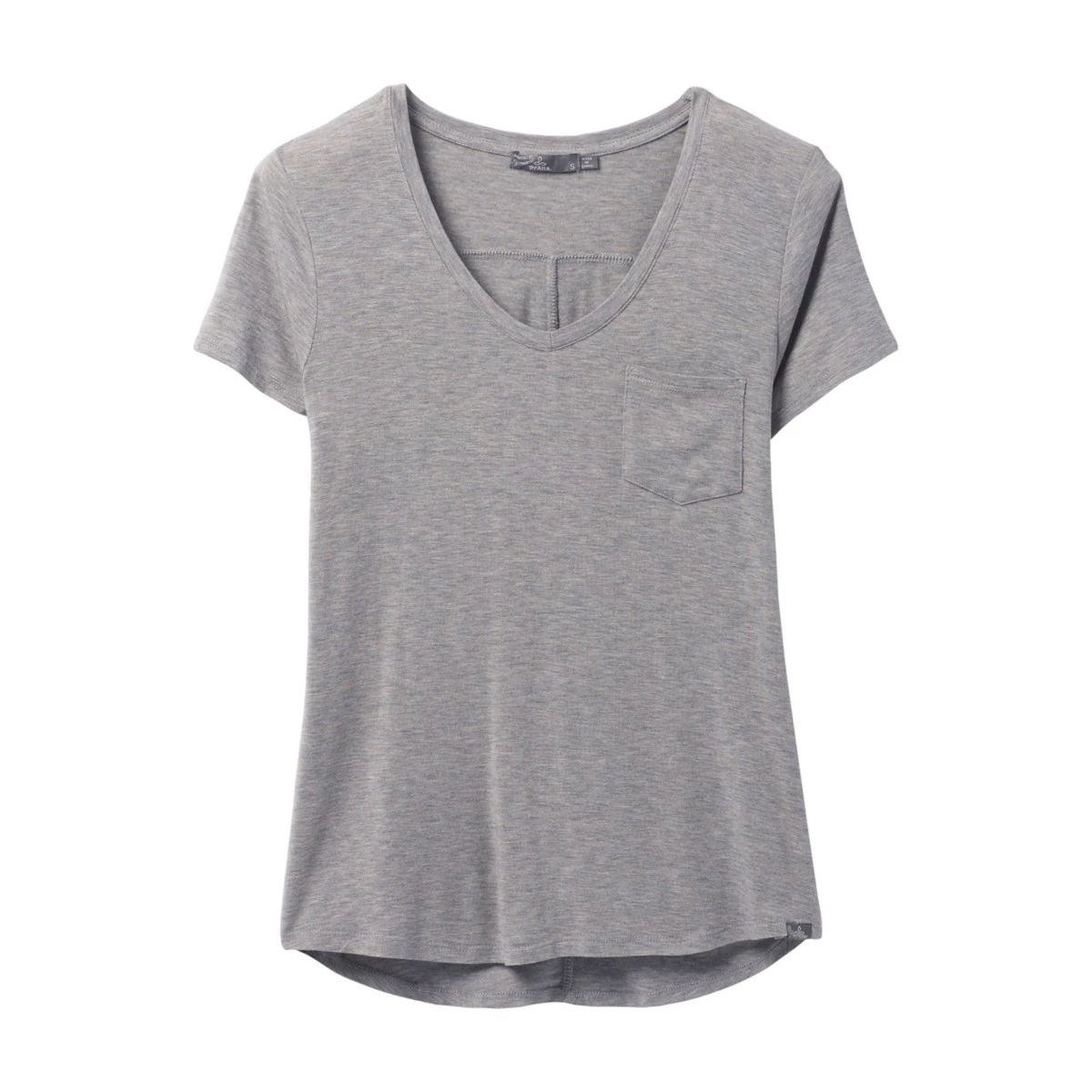 The prAna Foundation Short Sleeve V-neck for women is made from a lightweight stretch modal jersey. Design features include a boat neck, short-sleeve pocket tee silhouette, and a standard fit. Available in a variety of colors and patterns.