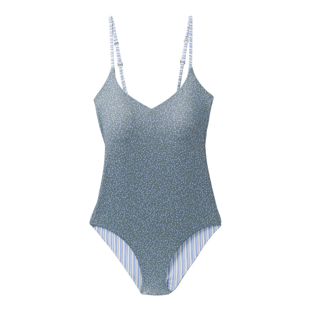 The prAna Jess Reversible One Piece for women can be worn two different ways and is made with ECONYL® regenerated nylon and built by a Fair Trade Certified™ Factory. Design features for this fitted style include an adjustable back strap detail, clean finish construction, removable soft cups, UPF 50+, and moderate bust coverage, seat coverage, and support.