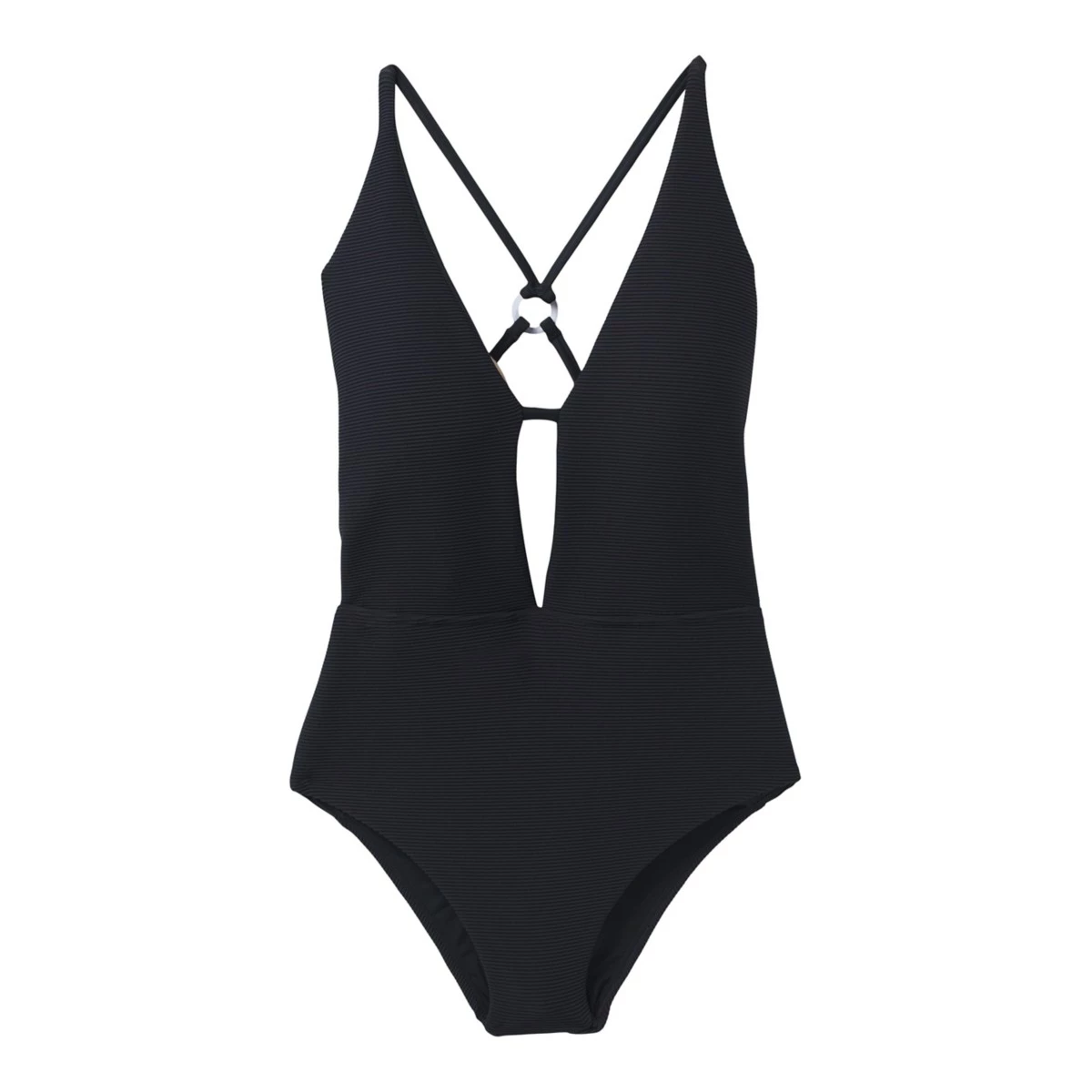 Recycled Ottoman, chlorine resistant, quick drying stretch fabrication. UPF 50+ Rated • Long triangle one piece with ring detail • Clean finish seaming • Front cut out detail • Dropped waistline • Open back, spaghetti strap detail with adjustable tie back closure • Recycled plastic ring detail • Removable soft cups • Minimum Coverage, High Leg, Cheekiest Seat Coverage