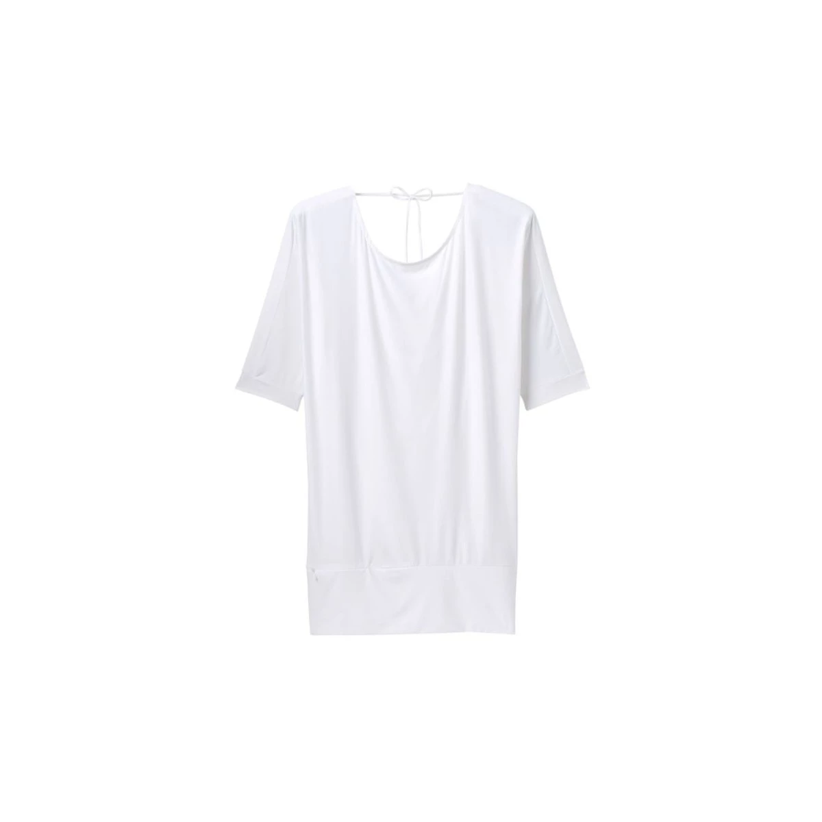 The prAna Ocean Rift Tunic for women is a bluesign® product made from recycled polyester. This lightweight performance jersey fabric offers natural quick-dry properties and is UPF 25+ rated. Design features of this tunic include a drop shoulder, 3/4 length sleeves, a wide boat neckline, a back cowl neck detail, a halter style back neck tie, and a discrete waistband zip pocket. The fit is relaxed and the tunic reaches thigh length.
