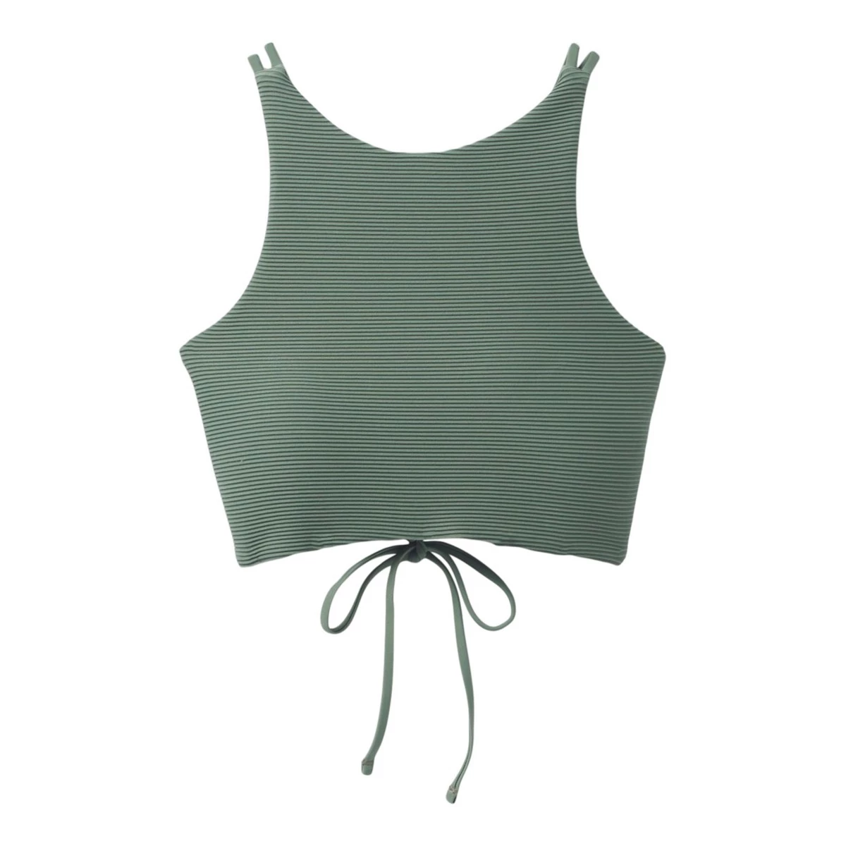Recycled Ottoman, chlorine resistant, quick drying stretch fabrication. UPF 50+ Rated • High neck top • Multi strap detailing • Adjustable shoulder straps • Tie back closure • Fully lined • Removable soft cups • Max Coverage, Moderate Support